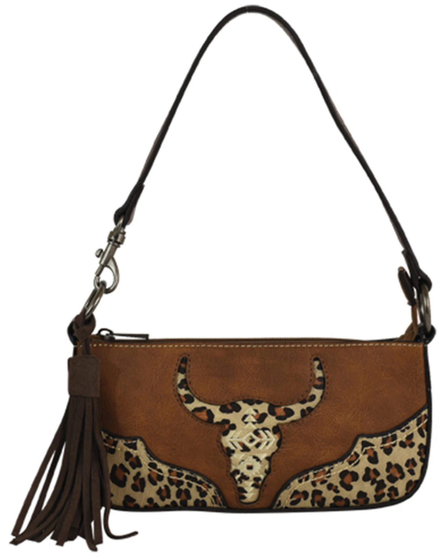 - Exterior features embossed embroidered steer head, cheetah print, decorative fringe tassel strap