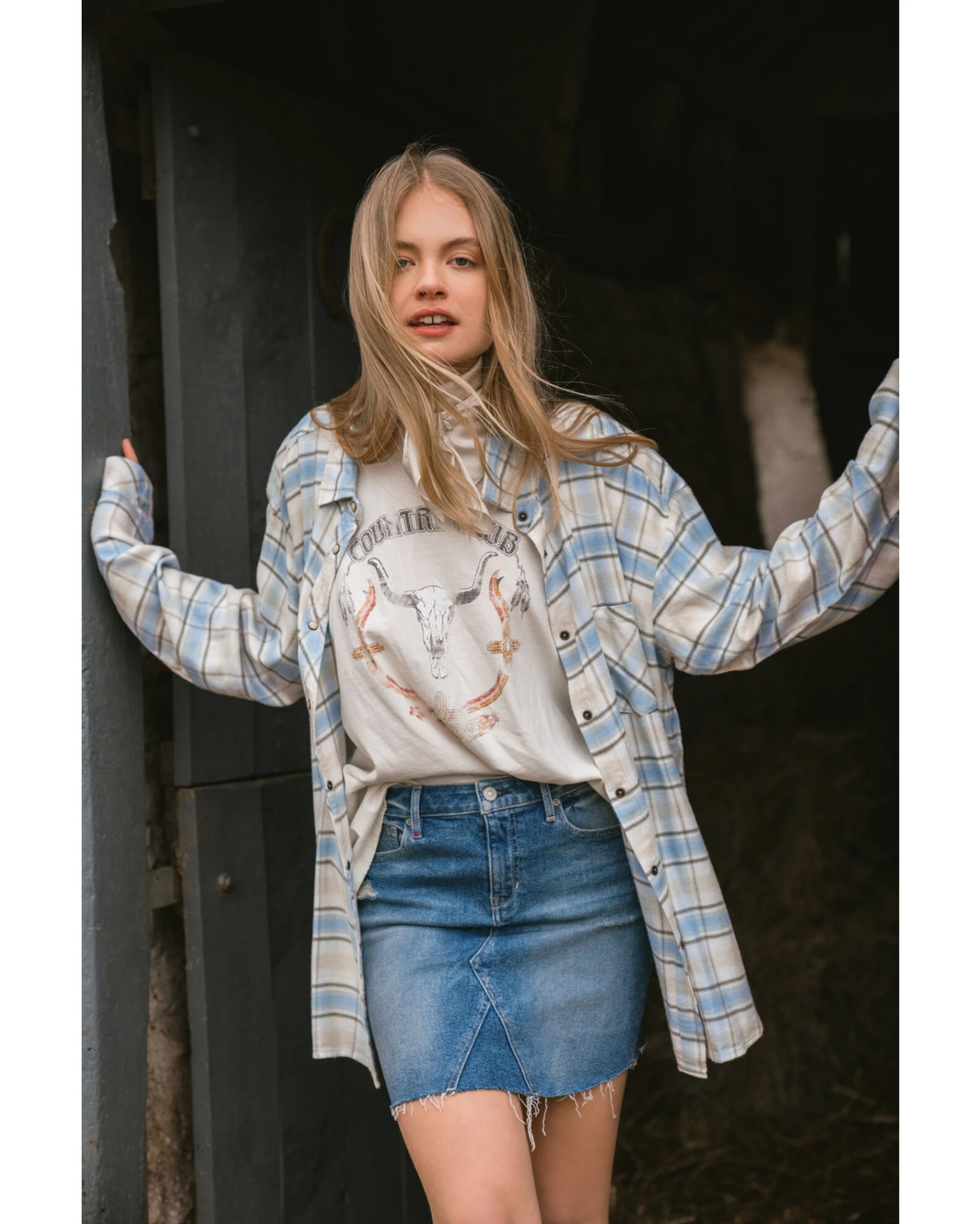 - “Country Club” with steerhead skull, feathers, and Native American necklace graphic on front