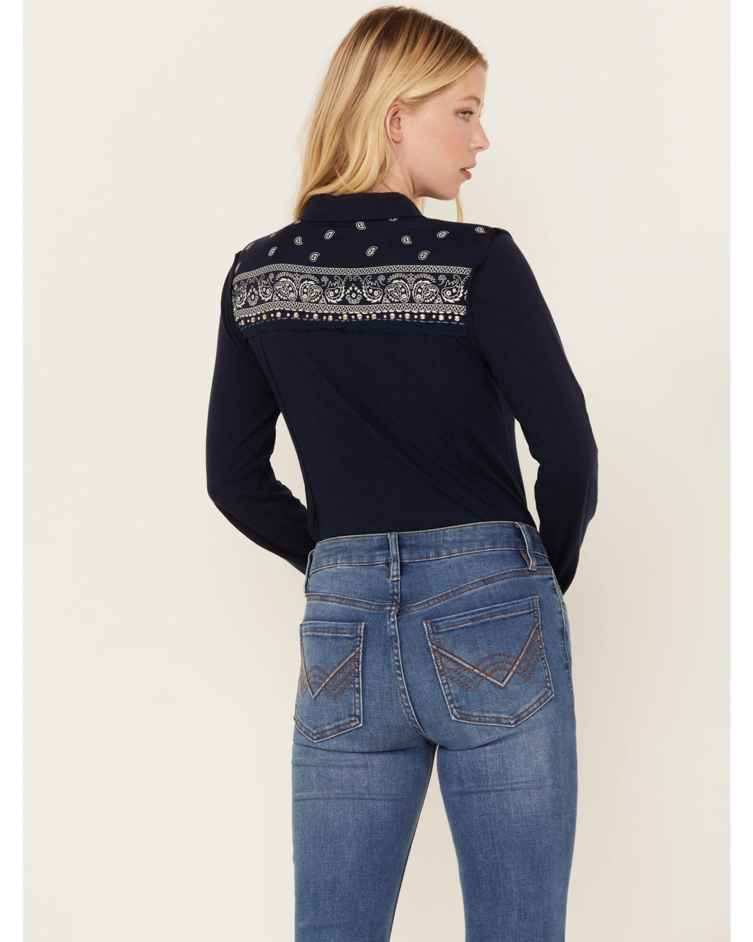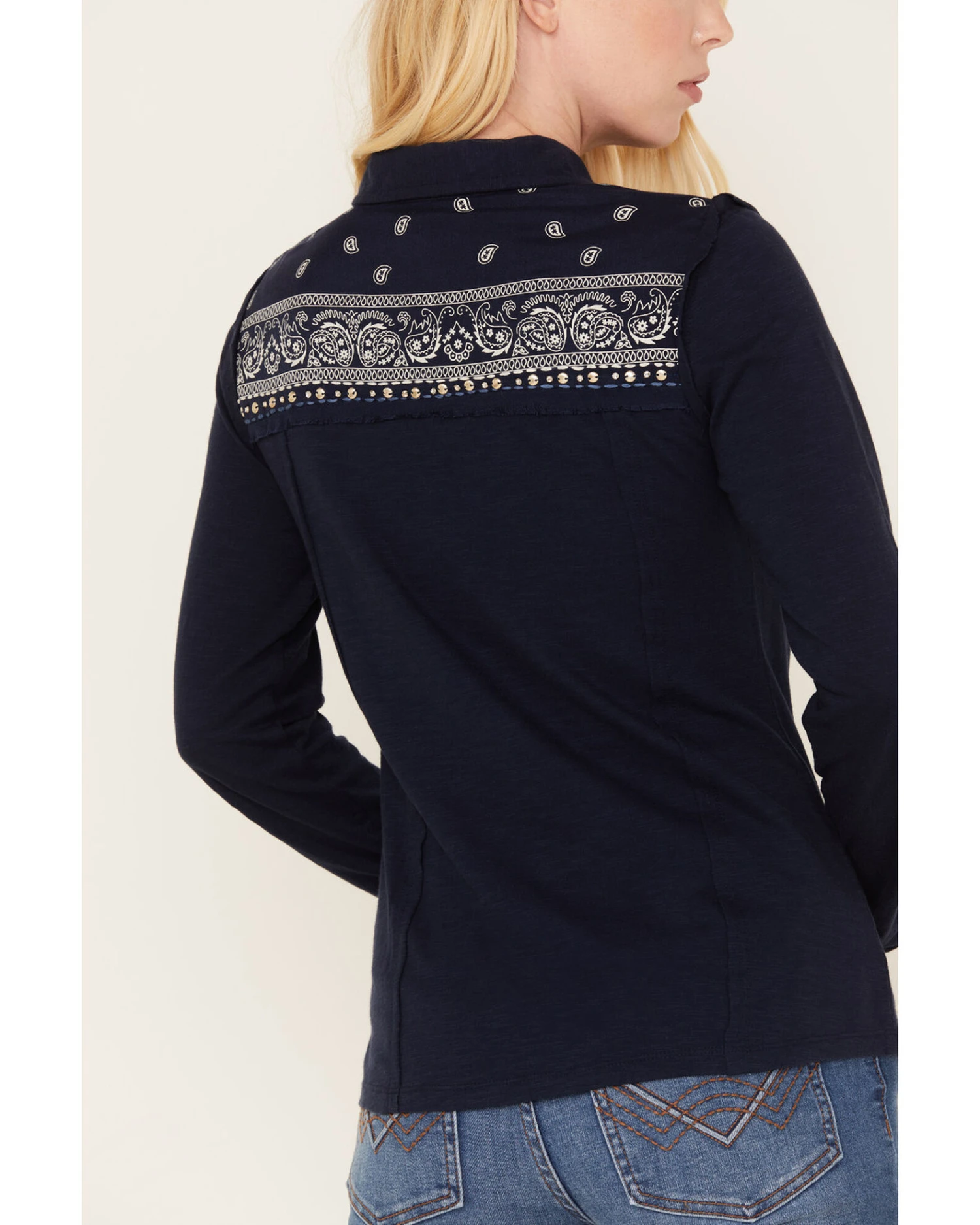 - White bandana print and sequins design on yokes