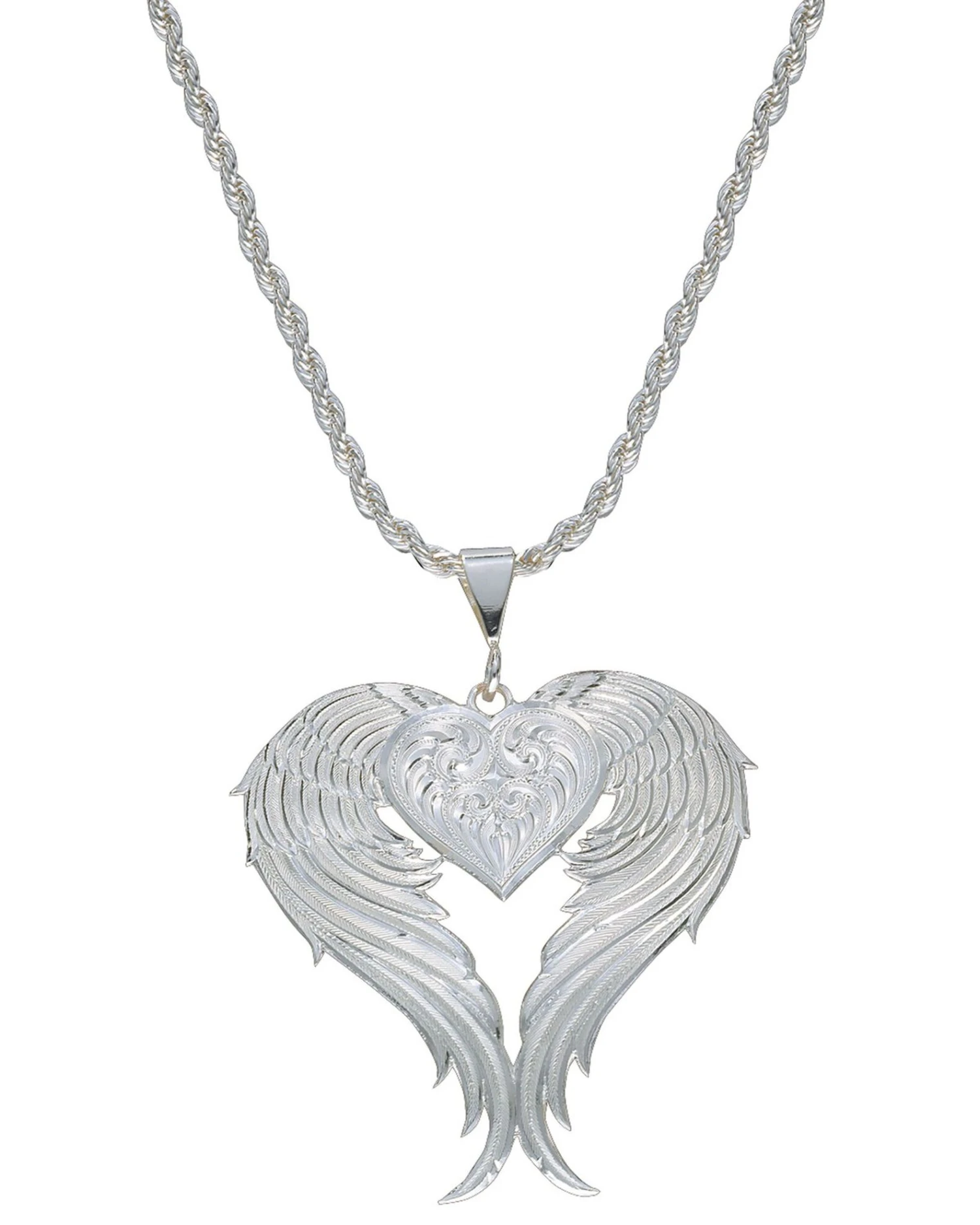 Add a modern western flair to any outfit with this Montana Silversmith Heart and Angel Wing Pendant Necklace. This necklace has a show stopping shiny finish with a twisted chain and a heart and angel wing pendant. Whether you are out for a ride or a night on the town this necklace will add western style to any outfit. To maintain you jewelry’s brilliance wipe it occasionally with a damp cloth. DO NOT use chemical or abrasive cleaners, as that will remove the protective coating on the jewelry.