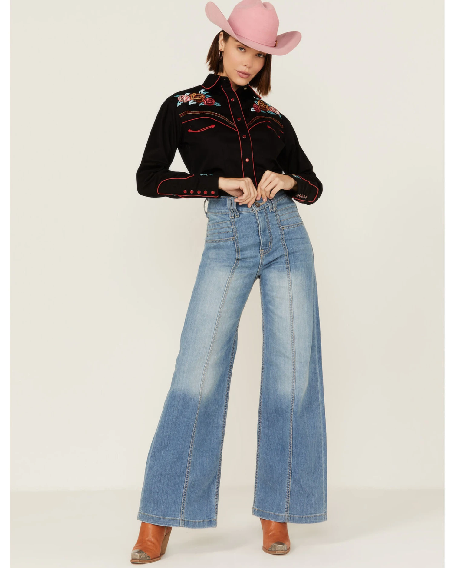 - Embroidered floral coverage on front and back western yokes, and cuffs