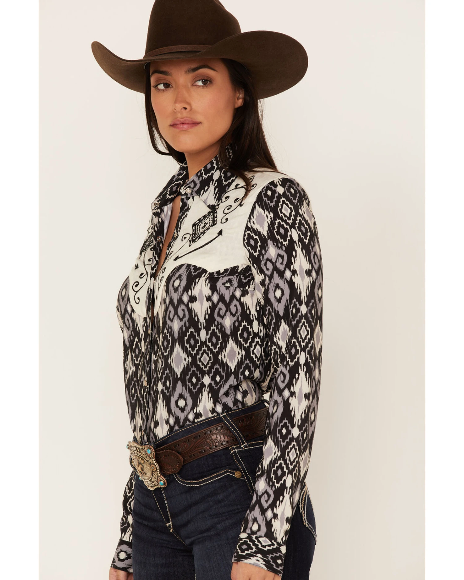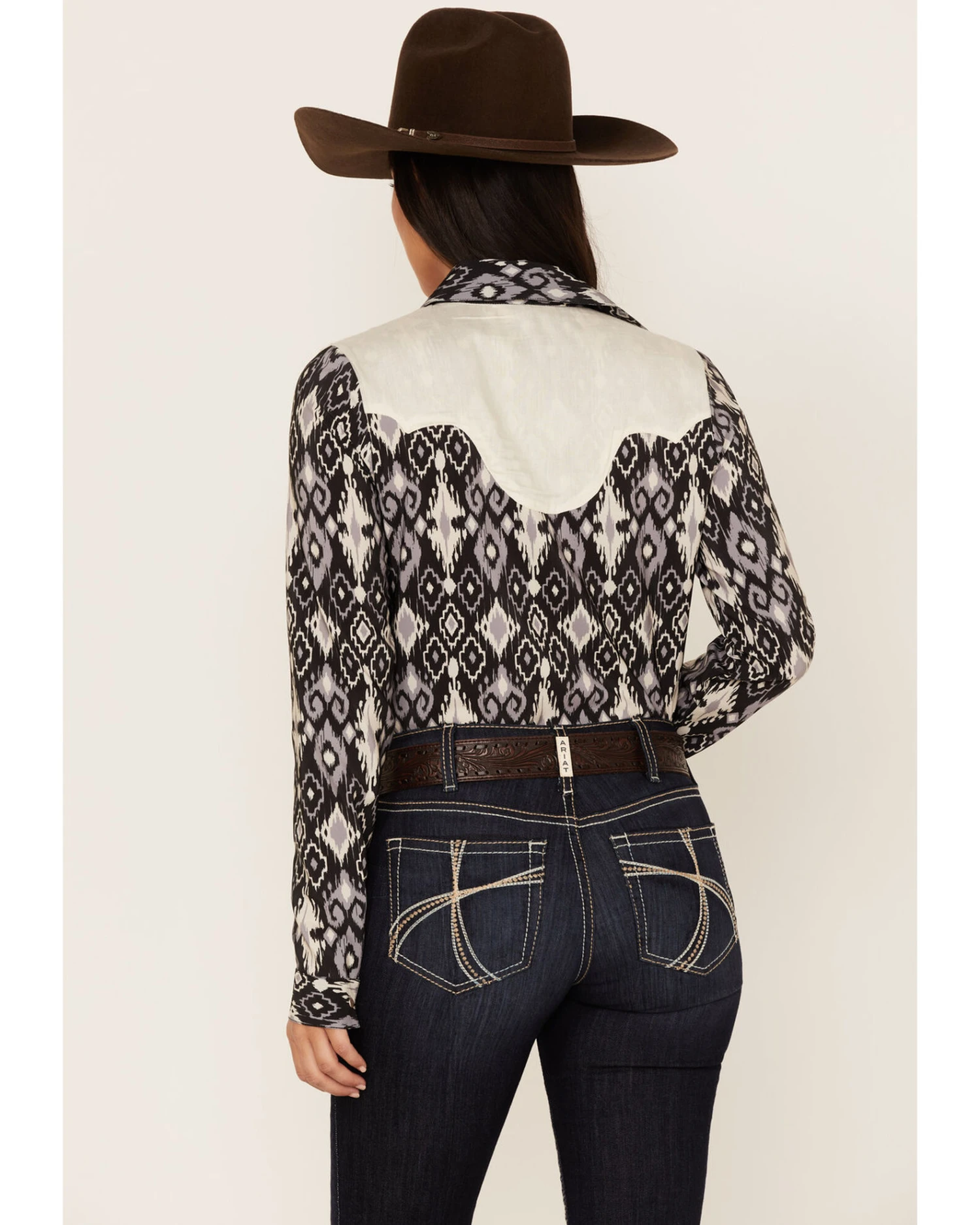 - Allover Southwestern diamond pattern with contrast yokes
