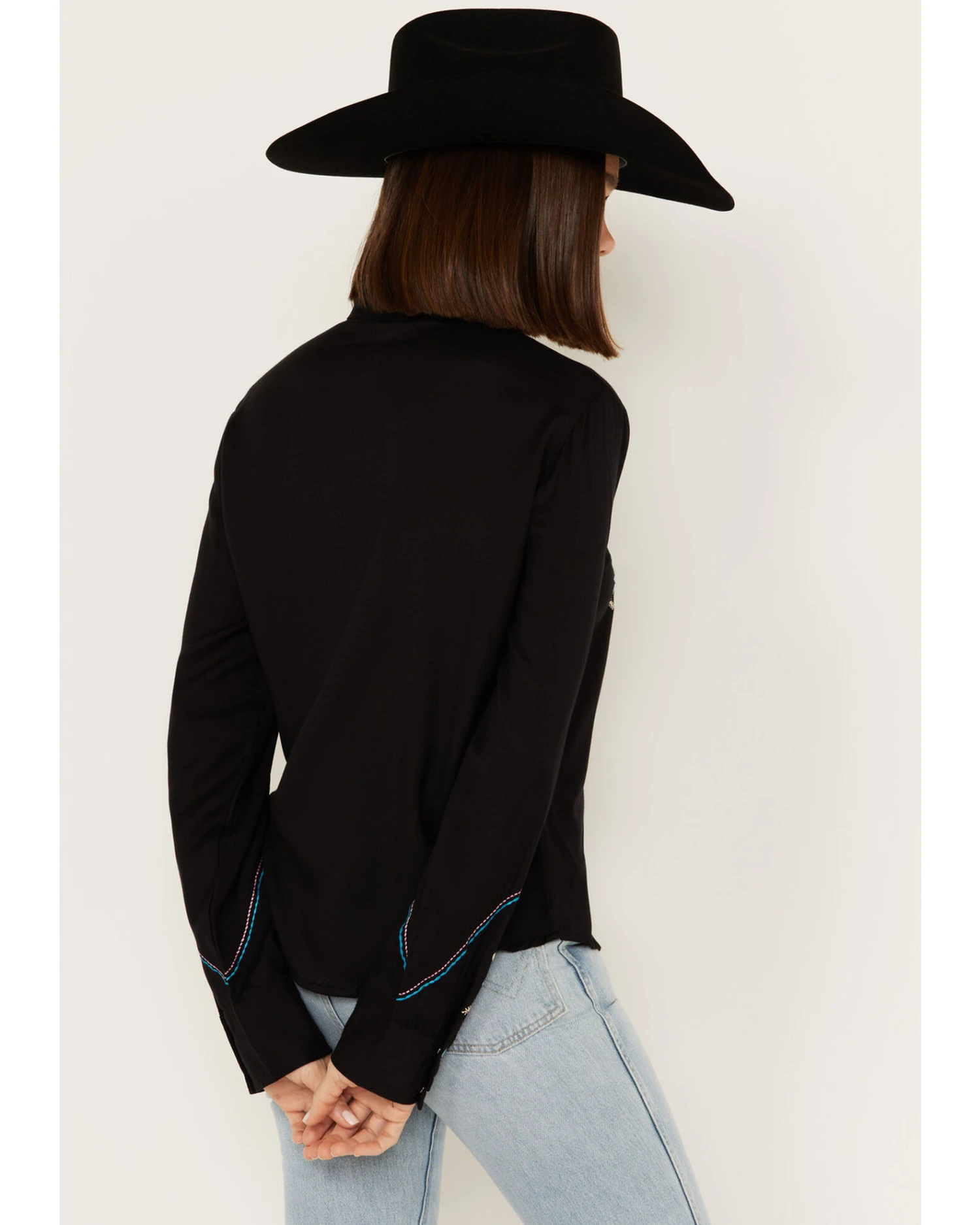 - Western yokes with pink and blue contrast stitching