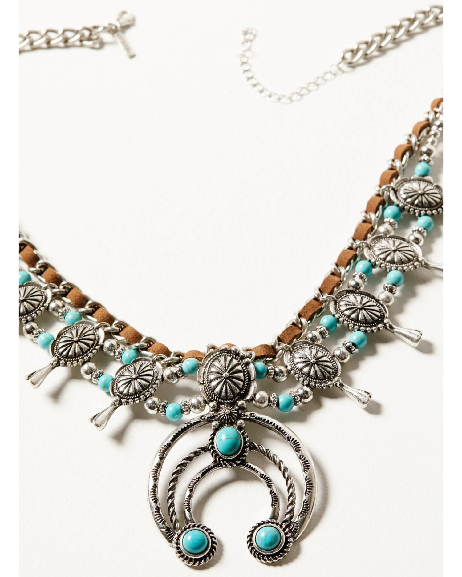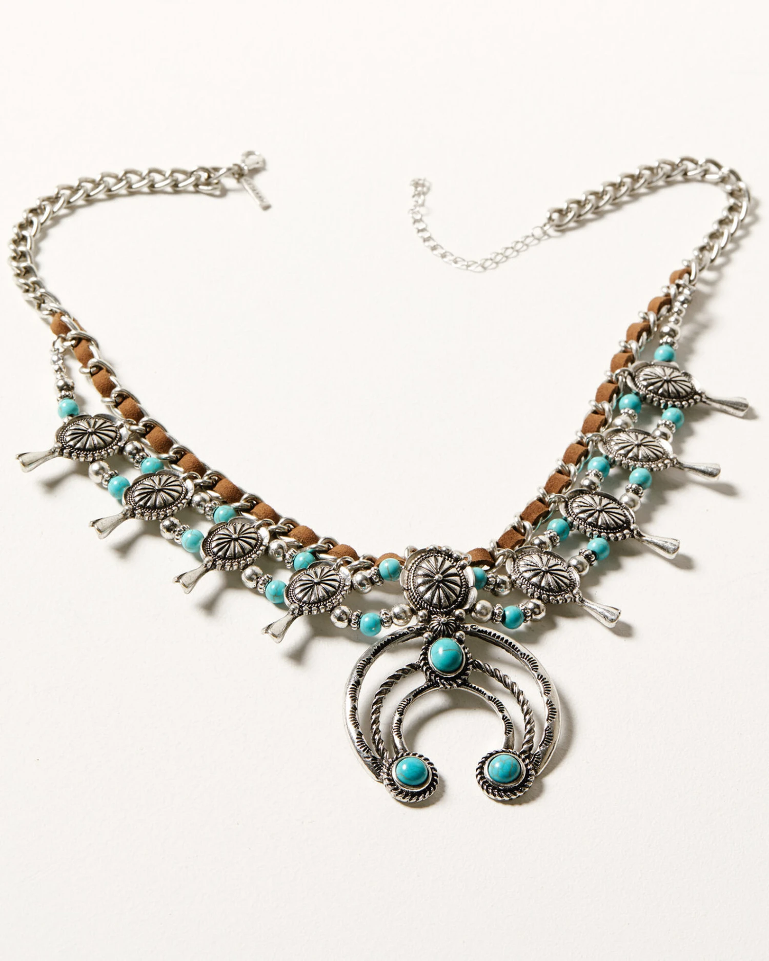 - Center statement squash blossom pendant with etched details and turquoise stone inlay